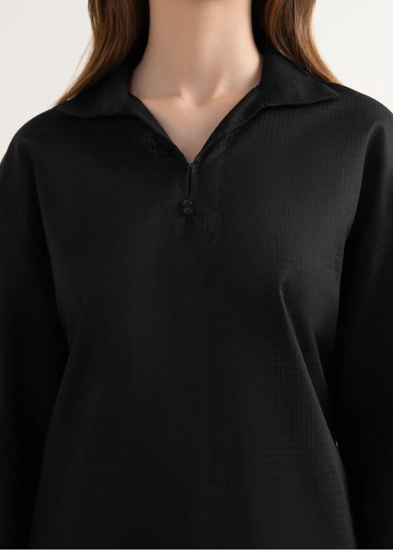 • Neckline: Minimal collar neckline with a subtle V-opening