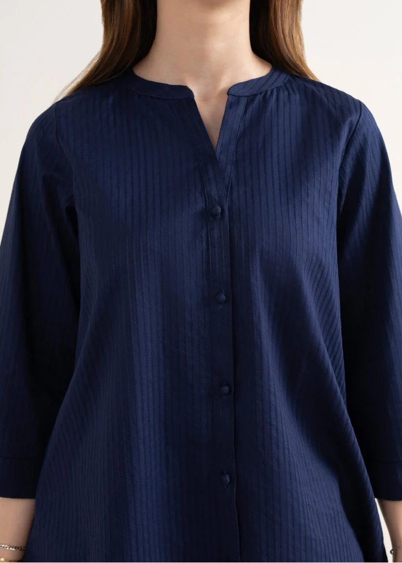 • Neckline: Minimal collar neckline with a subtle V-opening